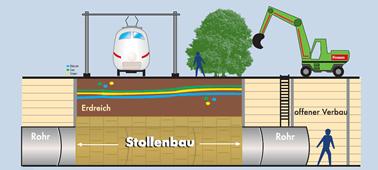 Dieses Verfahren kann sowohl in kurzen Strecken als auch in Haltungslängen von Schachtbauwerk zu Schachtbauwerk angewandt werden. Da der Stollen bemannt aufgefahren wird, kann er über einem alten defekten Kanal hergestellt werden. Dabei wird das Abwasser durch provisorisch verlegte Rohre, an die auch die Seitenkanäle angeschlossen werden, innerhalb des Stollens umgeleitet. Defekte Seitenkanäle wiederum können aus dem Hauptstollen durch Querstollen saniert werden. Diese Querstollen können in jeder Länge erstellt werden. Der neue Kanal kann hiernach an der Stelle des alten Kanals verlegt werden. Als Rohrdimensionen sind Steinzeugrohre DN 150 bis hin zu großen Stahlbetonquerschnitten möglich. Großrohrverlegung DN 2100/1200 im Stollen unter einer Bahnquerung)